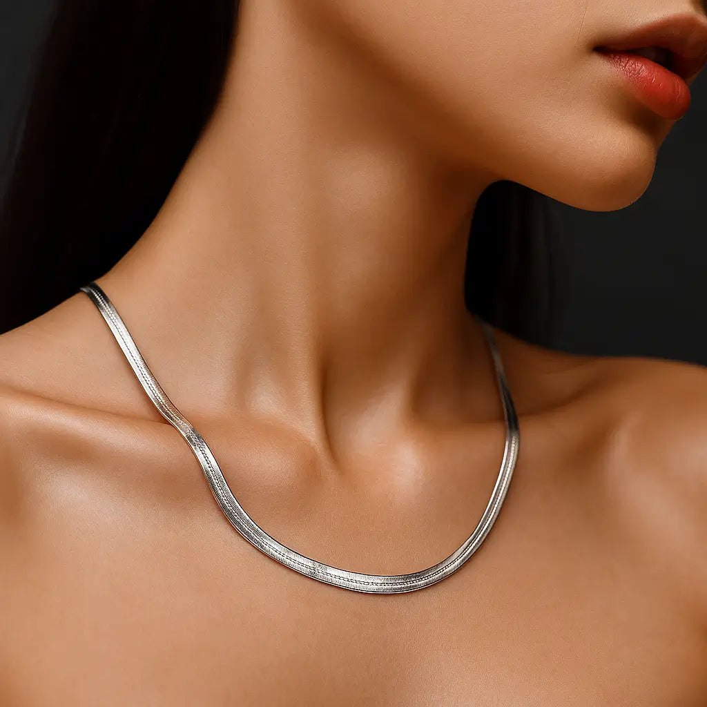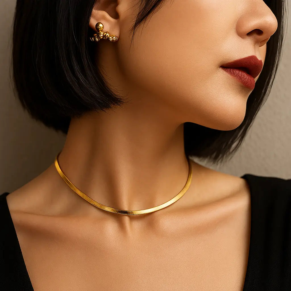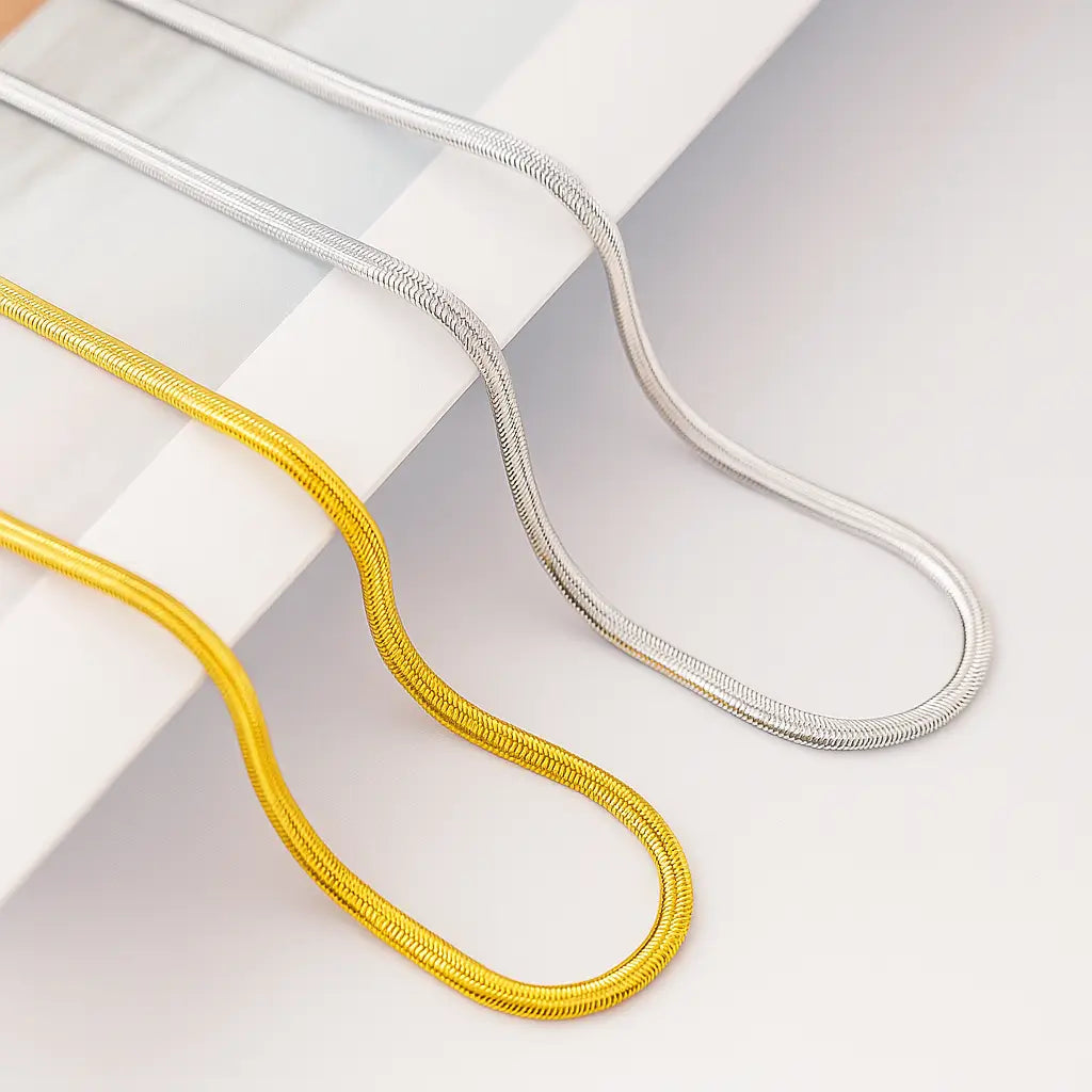 Produzido com tecnologia avançada de galvanização, o colar possui camada de ouro 18K ou banho de prata de alta pureza, garantindo brilho intenso, resistência e durabilidade — sem desbotar com o uso diário. Seu formato “cobra” ou “osso” se adapta suavemente ao pescoço, criando um visual marcante e elegante, perfeito tanto para composições casuais quanto sofisticadas.